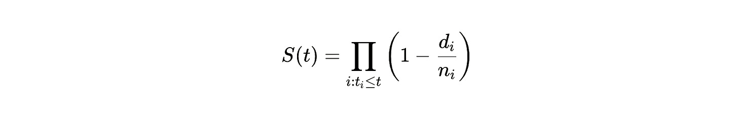 The Kaplan-Meier (KM) estimator measures the probability of a job posting remaining “alive” (open) over time. The mathematical foundation: