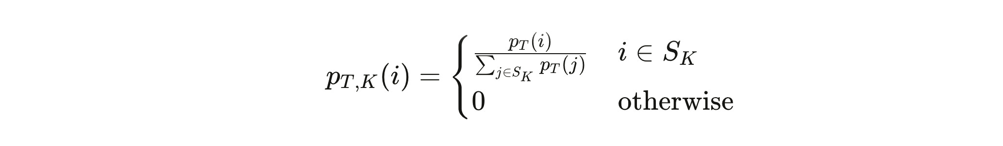 Top-K keeps only the K most probable tokens and throws the rest away. If K=50, you never sample from the bottom 99.9% of the vocabulary. The tail is gone. You renormalize across those 50 tokens and sample from that restricted set: