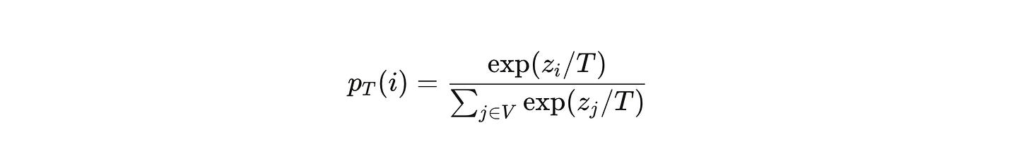 When T>1, you divide by a large number, shrinking the gaps. The distribution flattens. Tokens that had small logits get relatively larger. Tokens that had large logits lose their dominance. You start sampling from the long tail—the weird, the unexpected, the sometimes inspired, the sometimes incoherent.