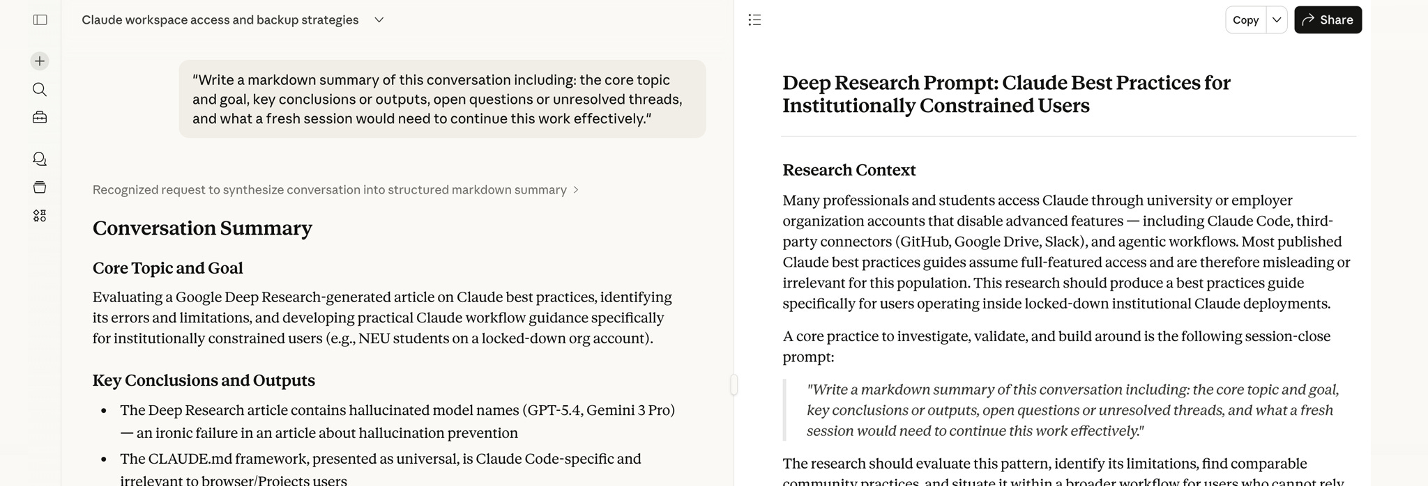 The corollary: never use Claude as your primary repository for research notes. Use it as a drafting engine. The notes live in Obsidian, or Zotero, or a versioned local directory. Claude generates drafts; you own the versions.
