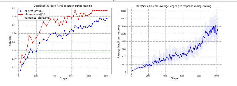 Figure 1 (a) AIME accuracy of DeepSeek-R1-Zero during training. AIME takes a mathematical problem as input and a number as output, illustrated in Table 32. Pass@1 and Cons@16 are described in Supplementary D.1. The baseline is the average score achieved by human participants in the AIME competition. (b) The average response length of DeepSeek-R1-Zero on the training set during the RL process. DeepSeek-R1-Zero naturally learns to solve reasoning tasks with more thinking time. Note that a training step refers to a single policy update operation.