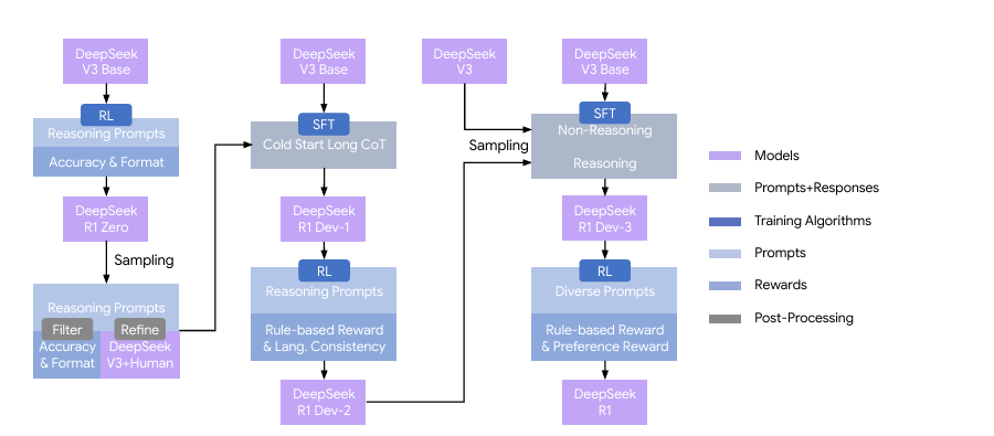 Paper Figure 2 | The multi-stage pipeline of DeepSeek-R1. A detailed background on DeepSeek-V3 Base and DeepSeek-V3 is provided in Supplementary A.1. The models DeepSeek-R1 Dev1, Dev2, and Dev3 represent intermediate checkpoints within this pipeline.