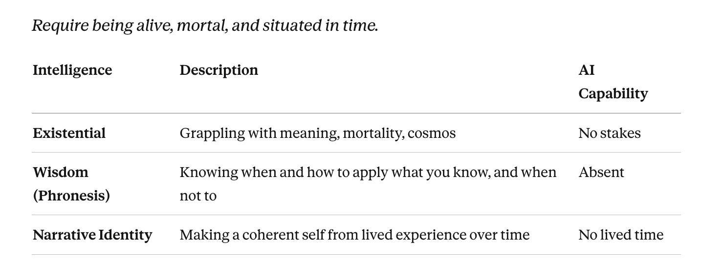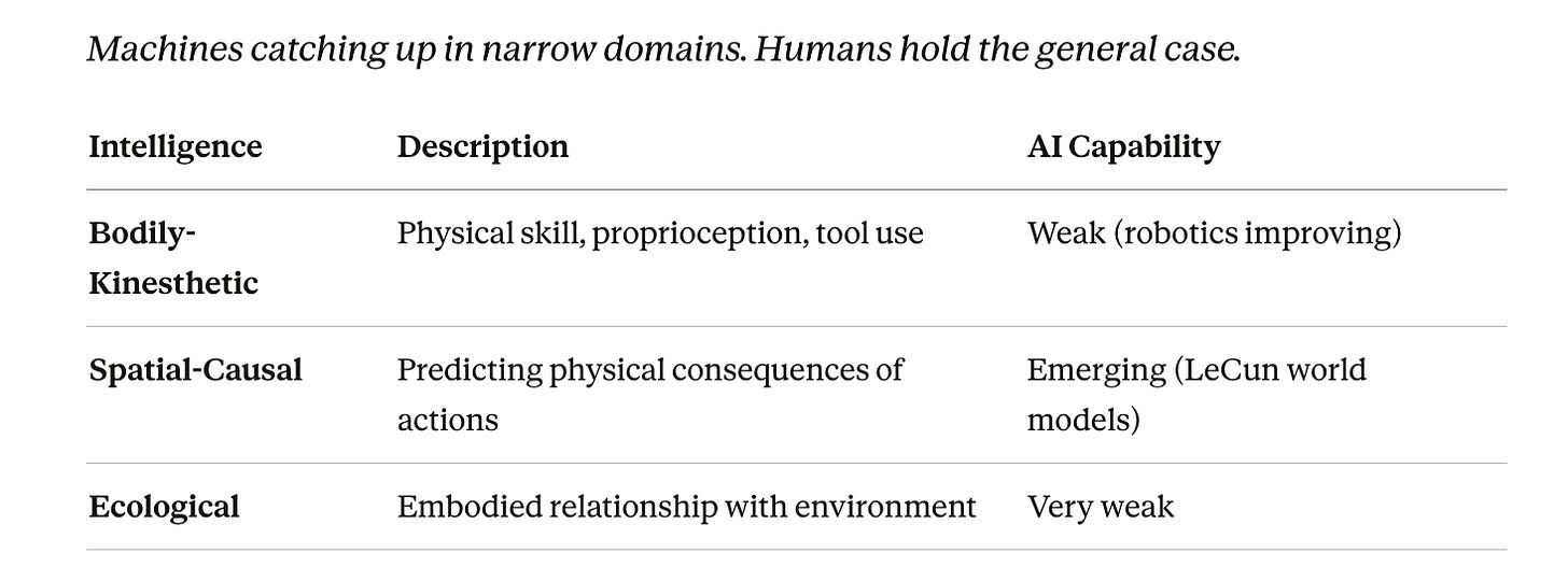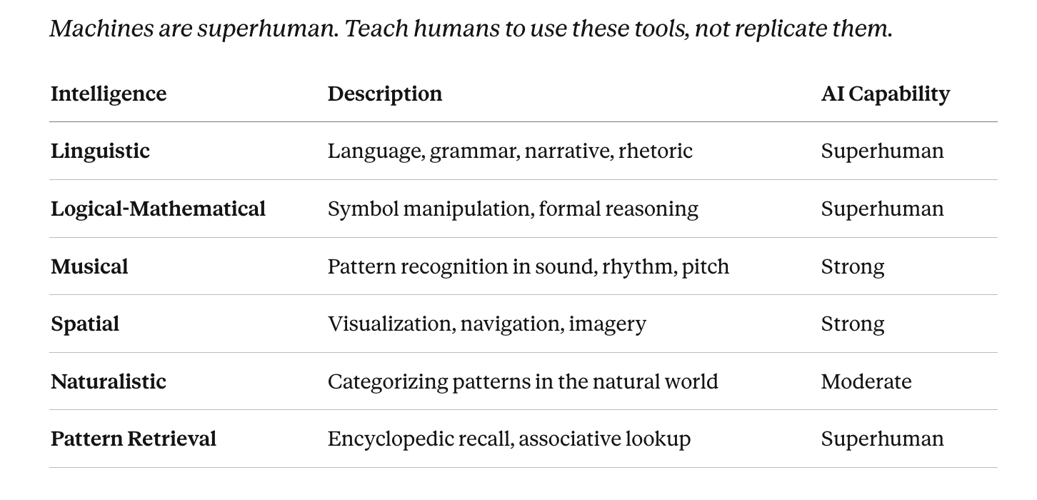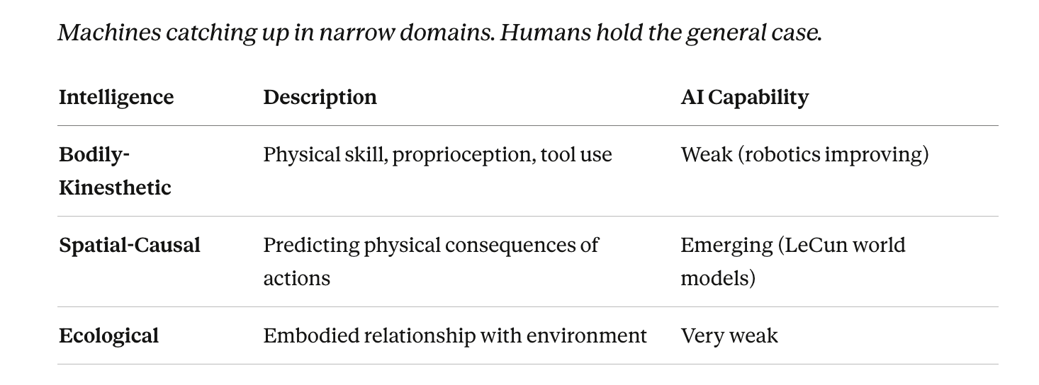 The moment has changed. Gardner’s framework was built before machines became capable. It did not need to ask which intelligences were endangered by technology, because technology — in 1983 — was not yet a serious competitor to any of them.