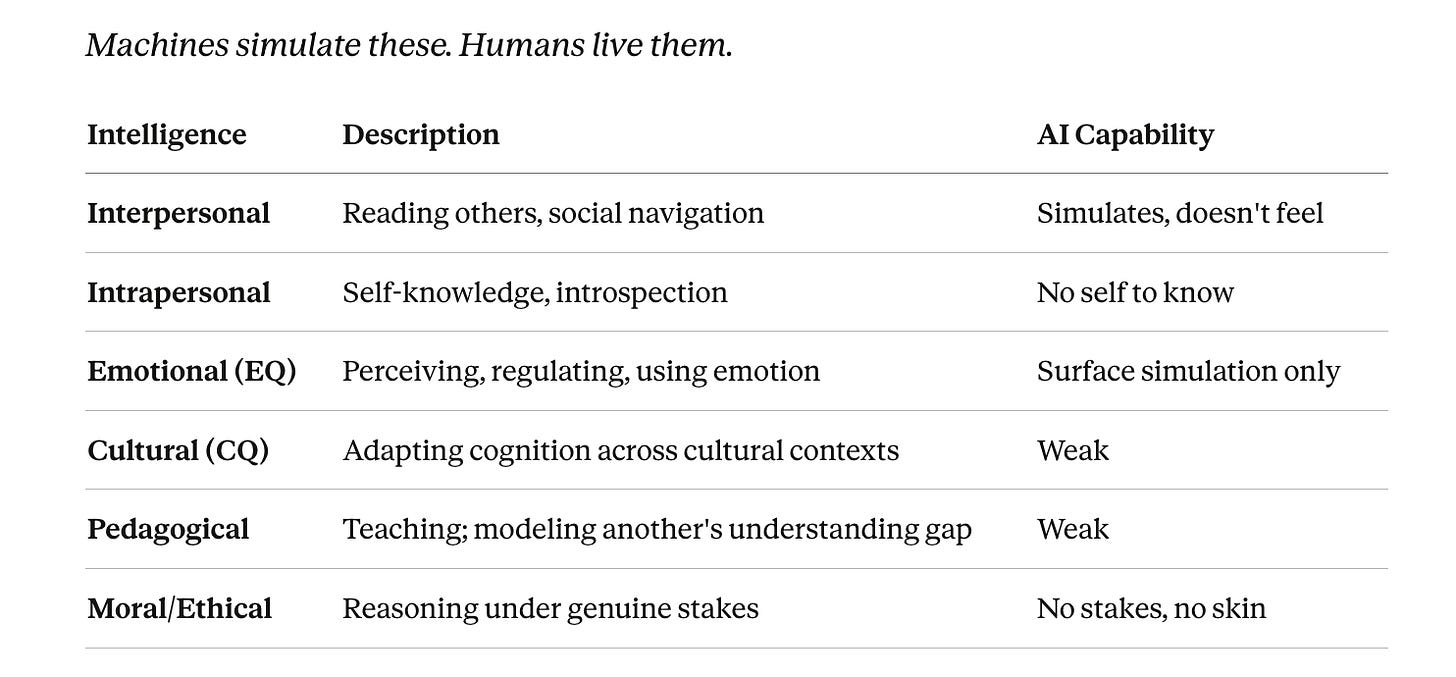 If this taxonomy landed — or if you think it’s wrong — say so below. Drop the intelligence type you’d add, the tier you’d reorder, or the educational implication you think I’ve missed. The next version of this framework gets built in the comments. Subscribe to Theorist.ai to follow the argument as it develops.
