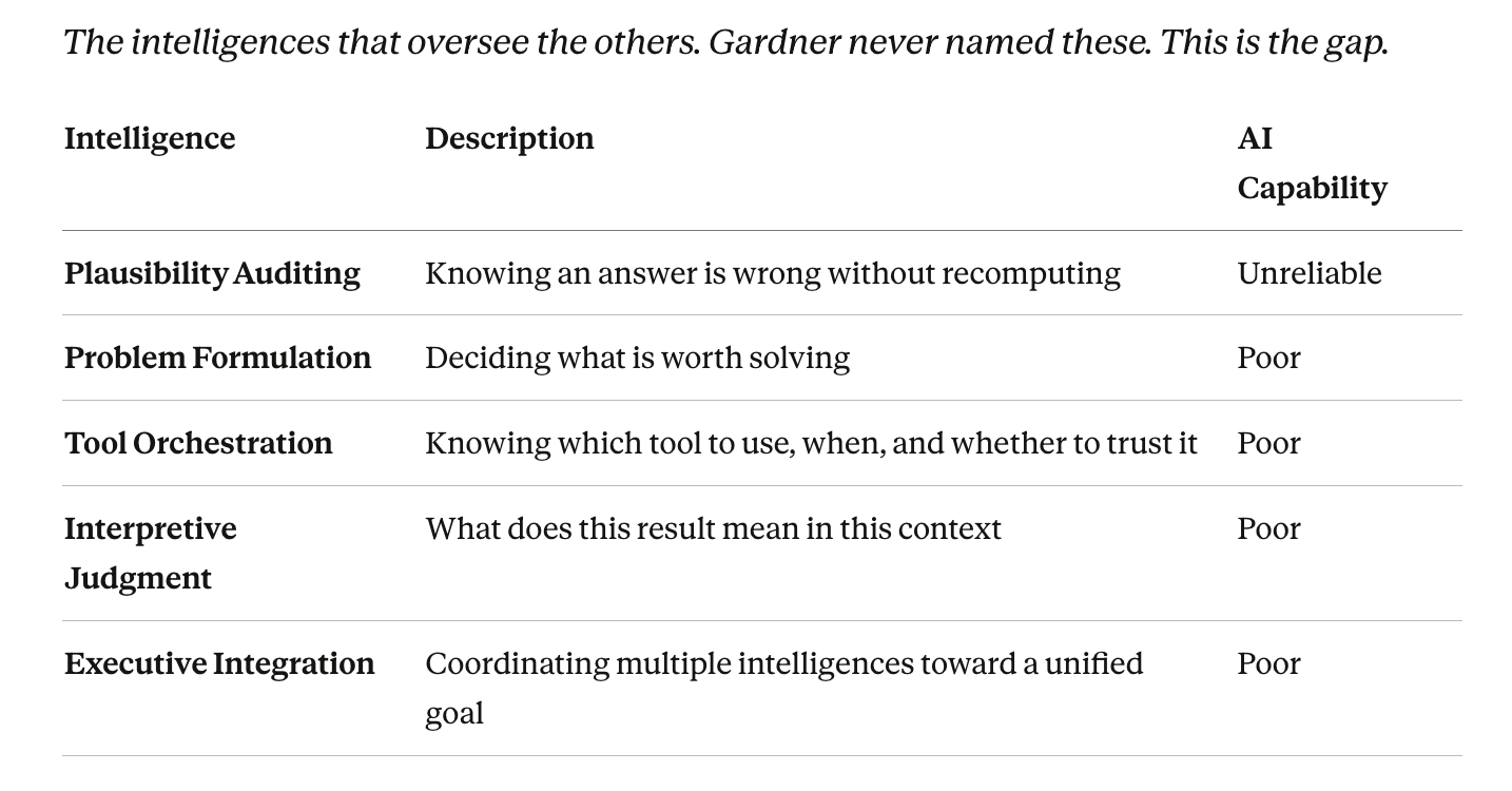 Tags: theorist.ai multiple intelligences taxonomy AI era, human intelligence tiers beyond Gardner, plausibility auditing causal reasoning education, metacognitive supervisory intelligence curriculum, LLM lossy compression collective human intelligence
