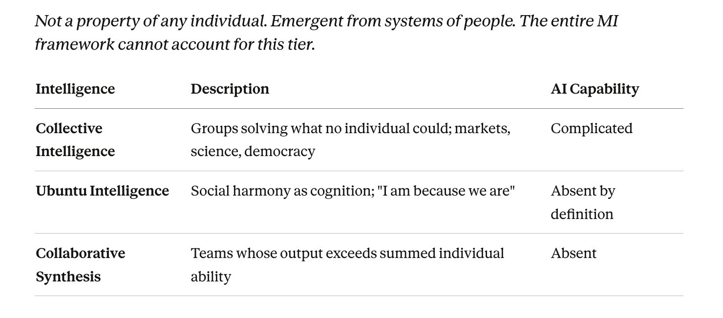 Tier 6 deserves its own moment. Collective intelligence is not a property of any individual — it is emergent, arising from systems of people in relationship. The entire multiple intelligences framework, Gardner’s and everyone else’s, is a framework of individuals. That framework misses the thing that makes science work, that makes markets sometimes aggregate information correctly, that makes democracy more than the sum of its voters. An education that produces excellent individual reasoners who cannot function in collaborative epistemic systems has not finished the job.