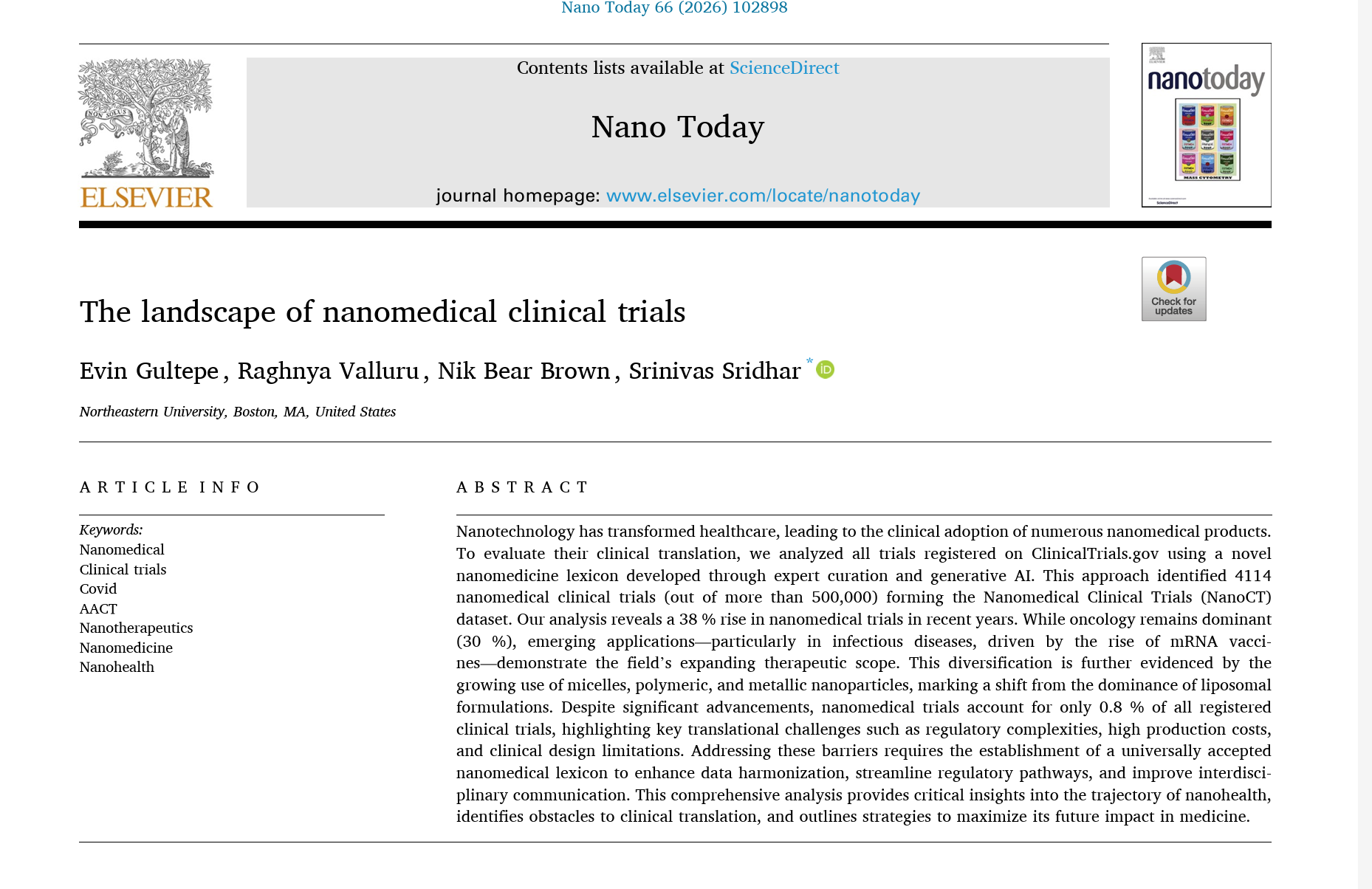 Evin Gultepe, Raghnya Valluru, Nik Bear Brown, Srinivas Sridhar, “The landscape of nanomedical clinical trials,” Nano Today, Volume 66, 2026, 102898, ISSN 1748-0132. https://doi.org/10.1016/j.nantod.2025.102898. (ScienceDirect)