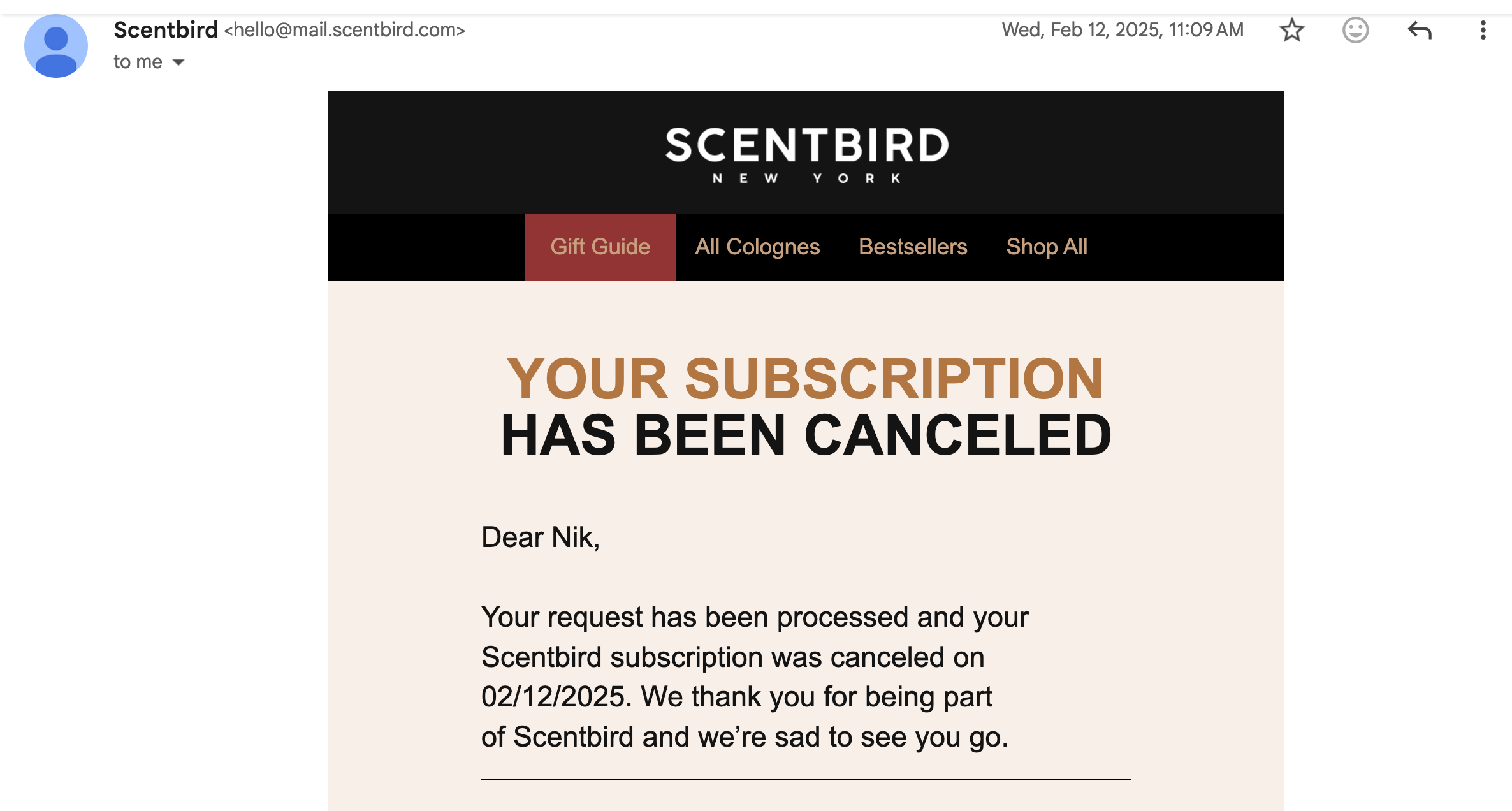 Scentbird, a fragrance subscription service, received a cancellation confirmation dated February 12, 2025. A year and two weeks later, the same company charged the same credit card. When that subscriber went back to the website to cancel again, there was no button. There were plenty of options to get a discount, pause, or skip a membership. But cancellation required an email — to a support team that responds to billing inquiries on Sundays at unusual hours, when charges are easier to slip through before an account closes.