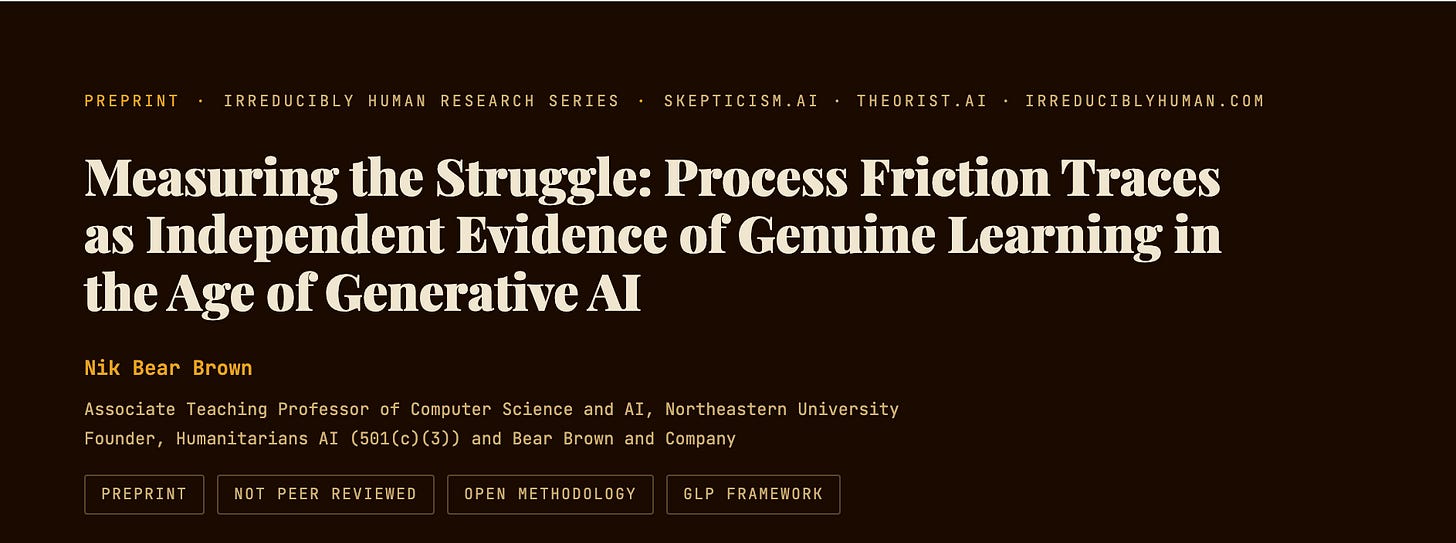 The framework that formalizes this argument — the specific components of friction that genuine learning leaves in observable data, the way those components can be measured, combined, and calibrated to different kinds of cognitive work — is documented in the paper that follows this introduction. It is technical in the way that any serious methodology is technical, and it is also not the point of this essay.