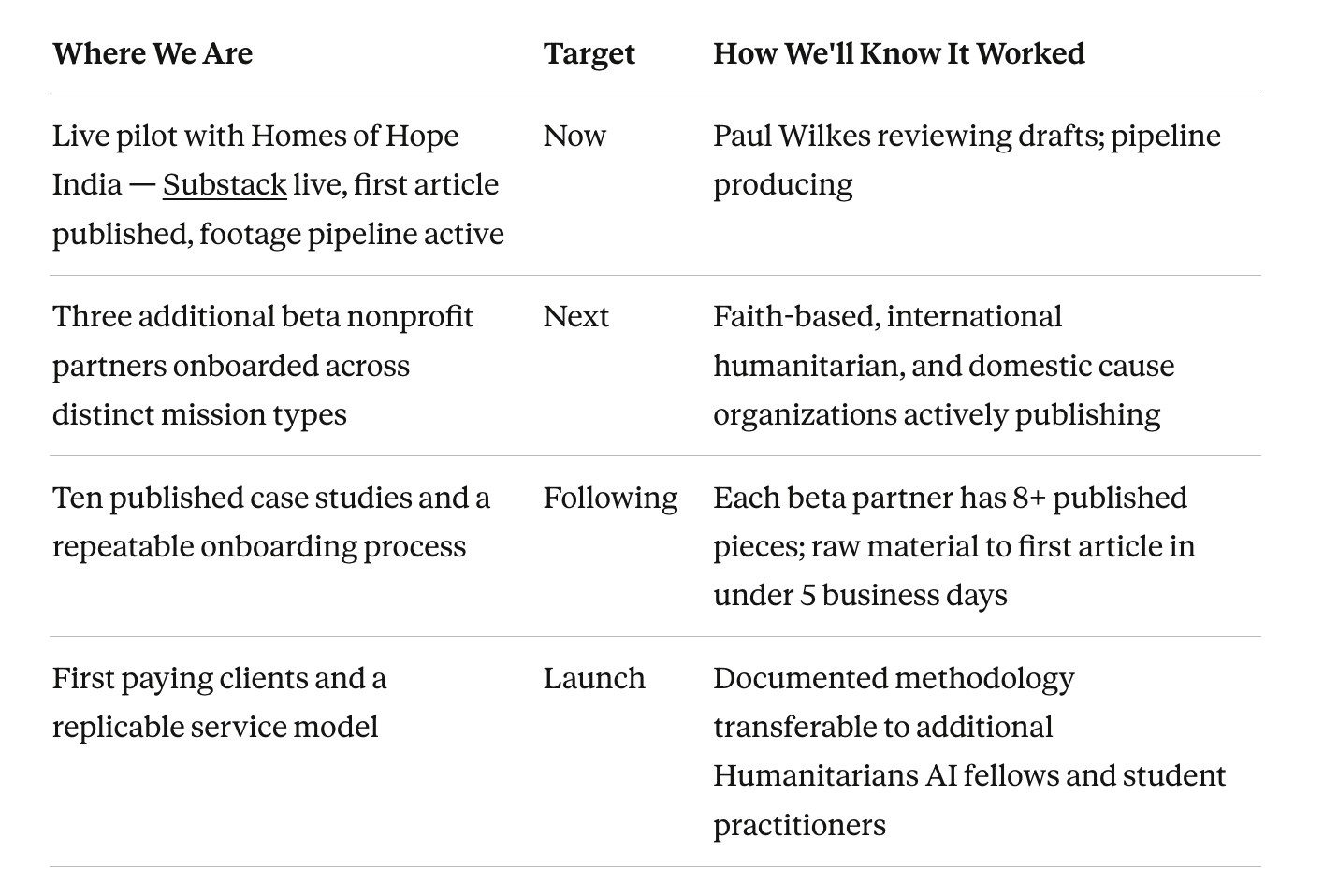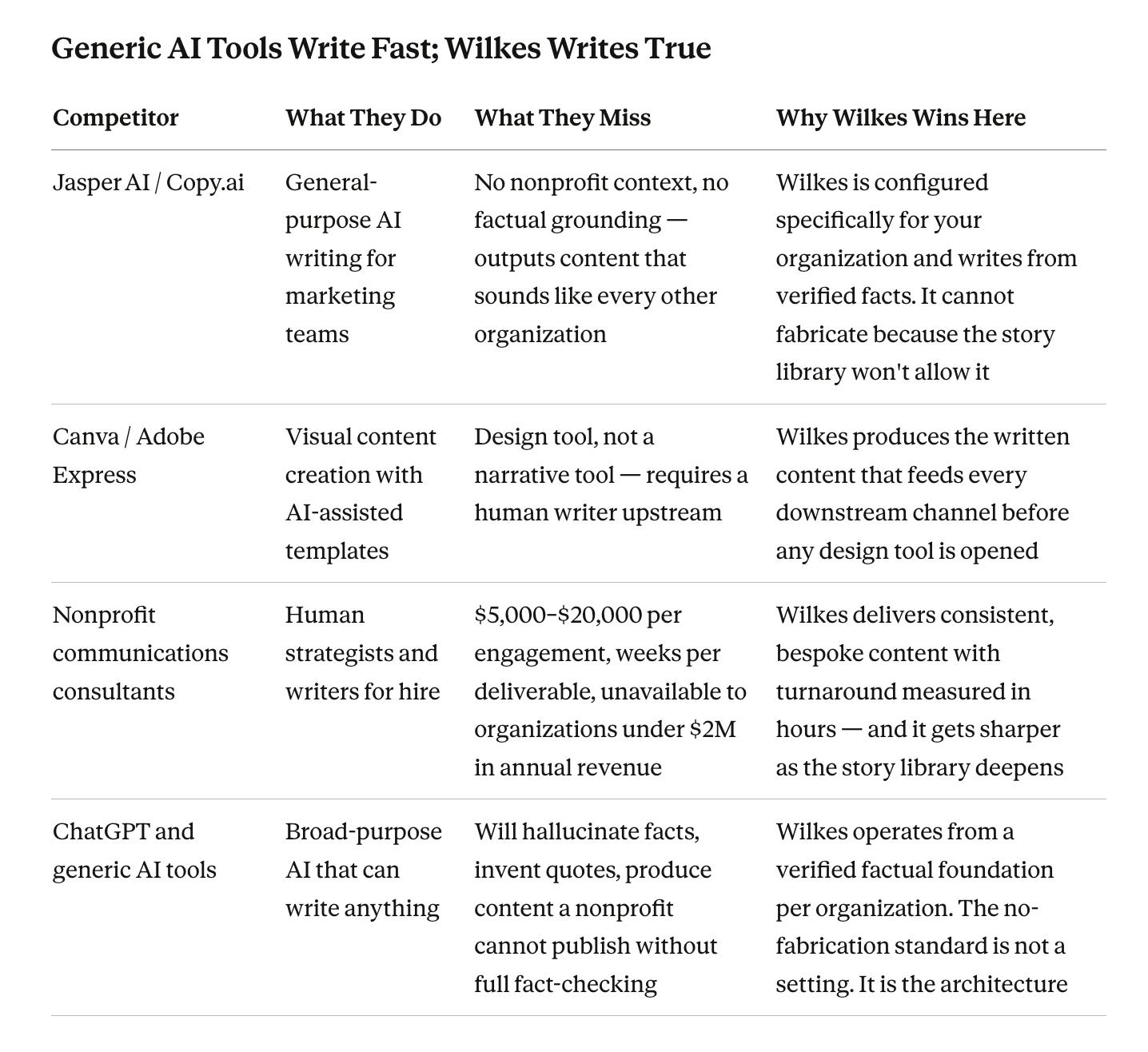 Wilkes’s edge is not the AI — it is the combination of the journalistic method, a verified per-organization story library, and a managed service that requires nothing from the nonprofit except raw material. No competitor can replicate the Paul Wilkes voice, the no-fabrication architecture, or the nineteen-year proof of concept already live at homesofhopeindia.substack.com.