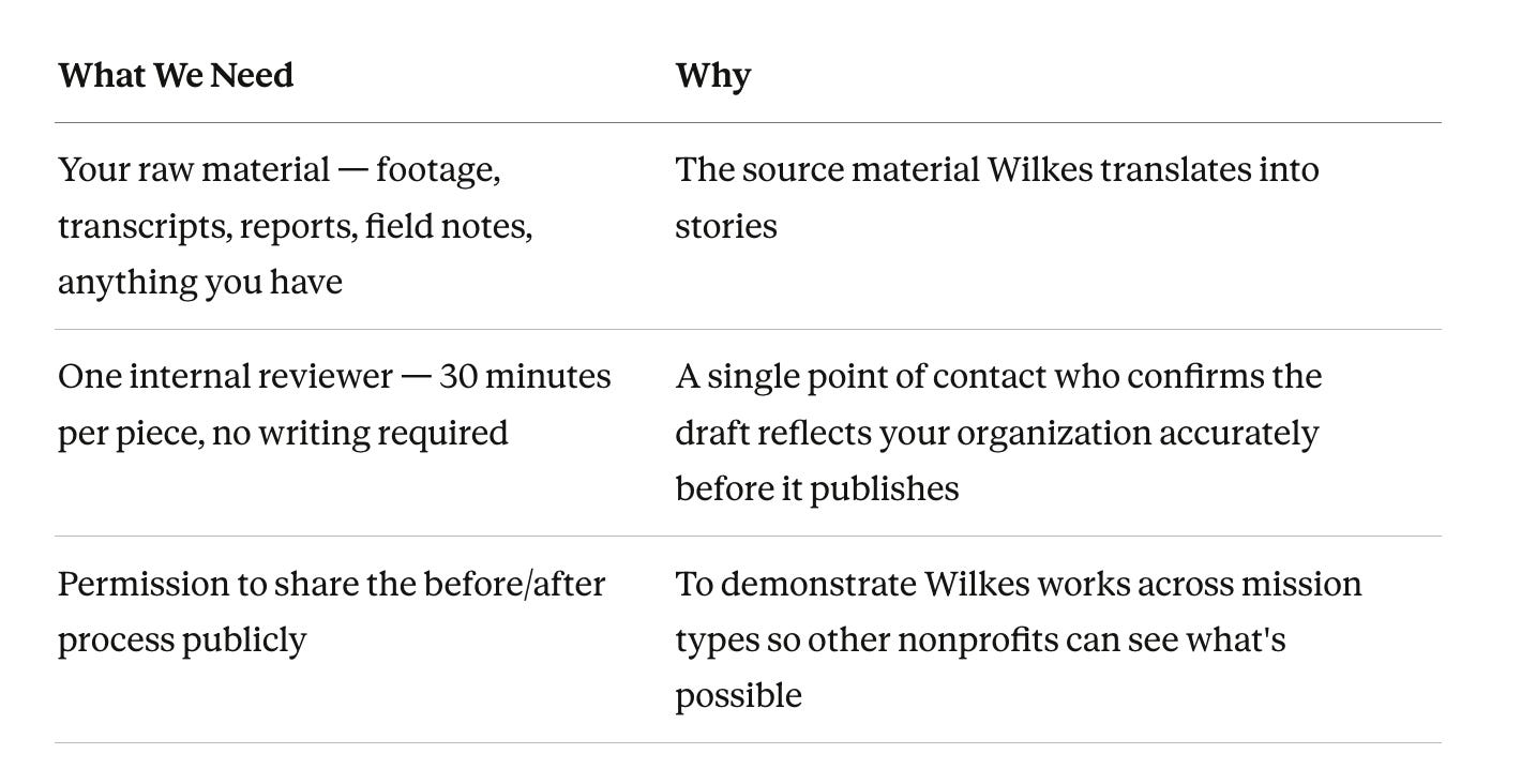 The nonprofit sent footage. Wilkes returned a finished story. No communications hire. No agency. No months of production.