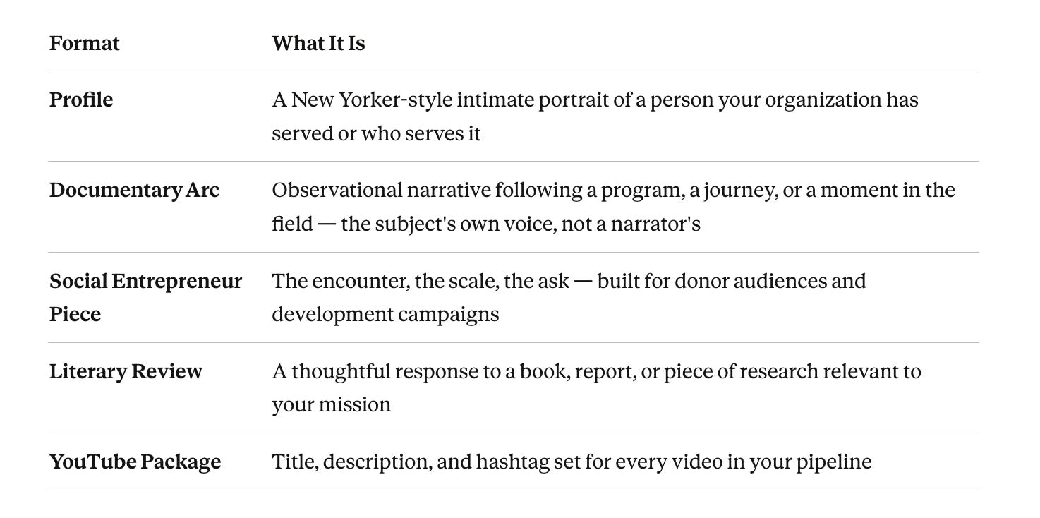 A profile of one of your graduates does not read like a press release. A documentary arc following a field team does not sound like fundraising copy. A donor-facing article does not perform urgency or manufacture sentiment. The writing earns trust because it is specific, grounded, and unmistakably yours.