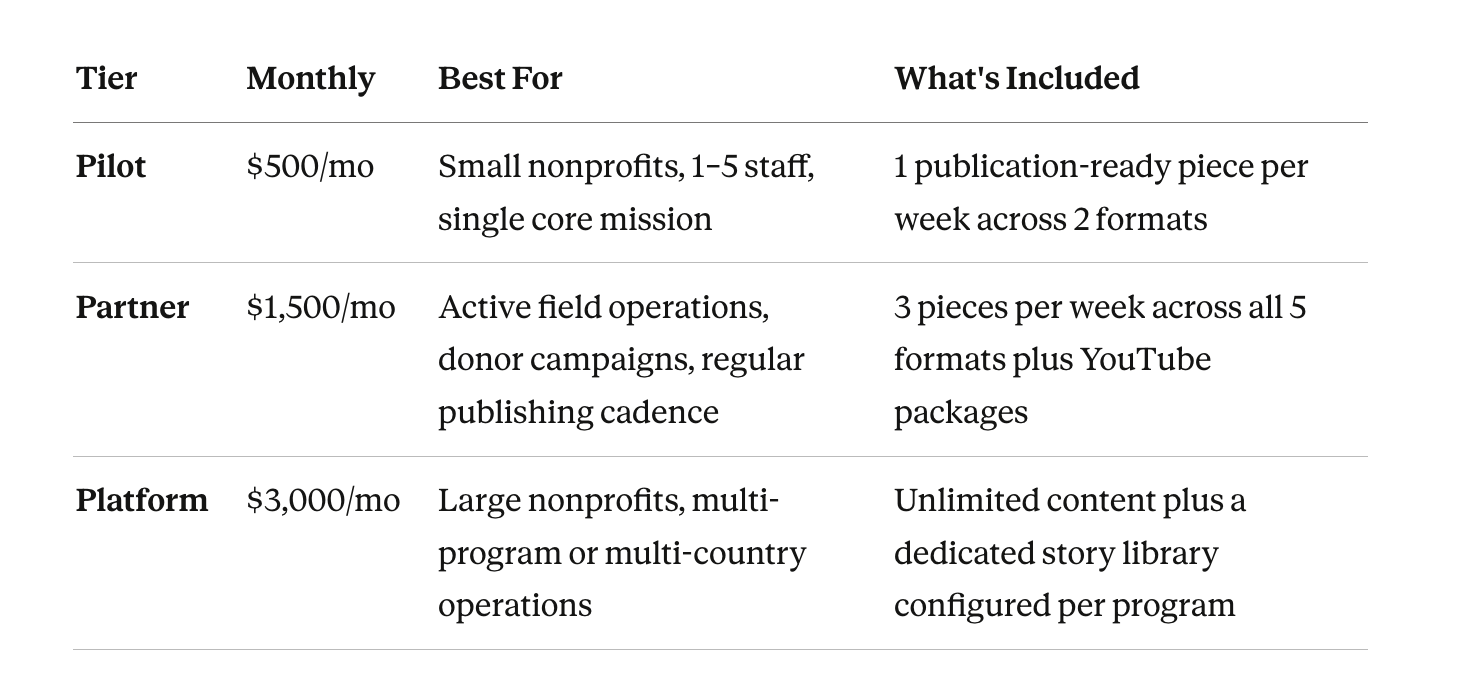 The first five nonprofit partners pay nothing. We configure the system for your organization, learn your voice, and produce content until you’re satisfied the writing sounds like you — and only you.