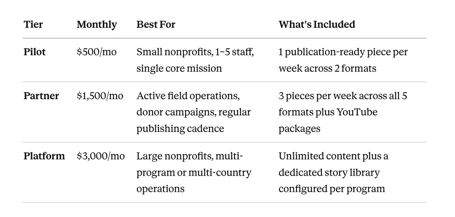 The first five partners are free — fully managed, no strings. For organizations that join after the beta, pricing is built around what nonprofits actually need: a complete service, not a tool to learn.