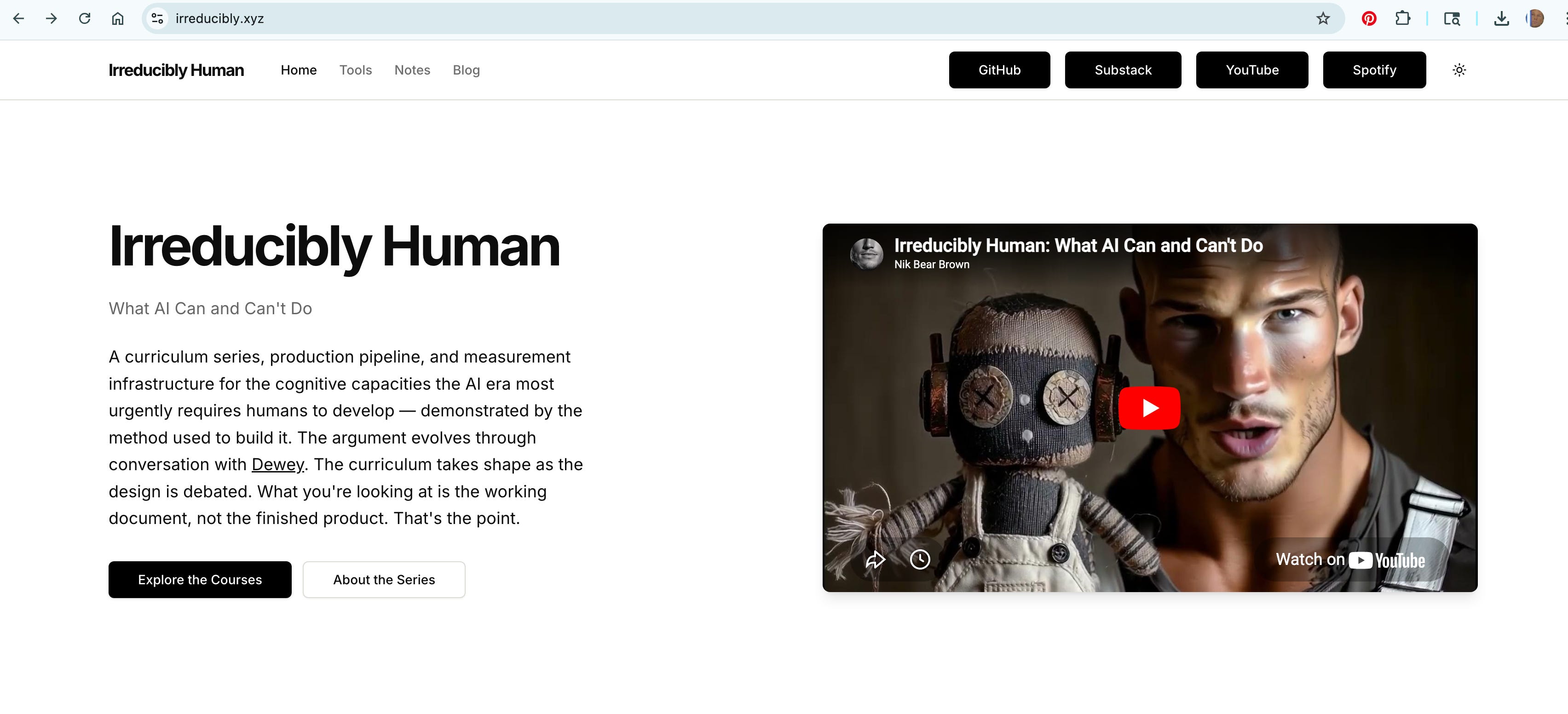 The name changed recently. It was called The Human Half: What AI Can’t Do. The rename matters. “What AI can’t do” is a defensive posture — we are mapping a shrinking territory, waiting to see how much ground we lose. “Irreducibly human” says something different. There are capacities that are not merely outside AI’s current capability. They are outside its fundamental nature. Not gaps waiting to be filled. Structure.