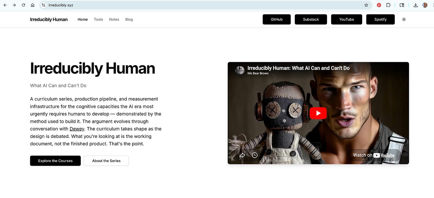 Irreducibly Human is explicitly Stage 1 of a three-stage sequence: Name it. Teach it. Measure it. Gardner did Stage 1 brilliantly. Forty years passed. The series is an attempt to hold Stage 1 more honestly — to name only what can be defined clearly enough to teach, and to be transparent about where the measurement infrastructure doesn’t yet exist. Stages 2 and 3 are in development, in collaboration with the Center for Curriculum Redesign. The series is not claiming to have completed them. It is claiming that Stage 1 done honestly — with specific learning outcomes, sequenced exercises, and defined criteria for success — is rarer than it sounds, and more necessary than the field has acknowledged.